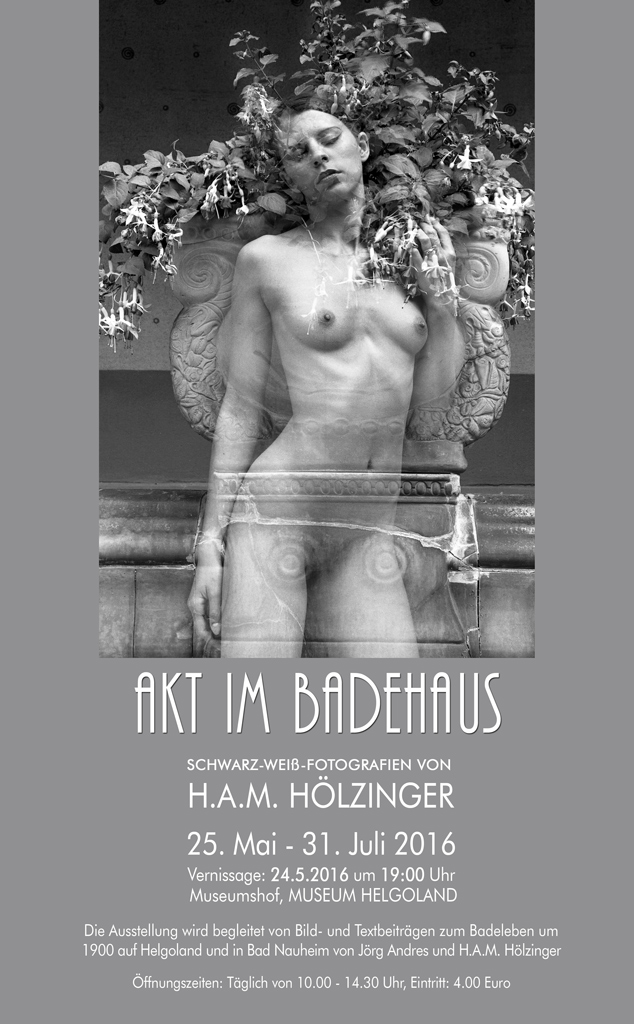 Die Bad Nauheimer Fotografin H.A.M. Hölzinger zeigt in Zusammenarbeit mit dem Museum Helgoland unter der Leitung von Jörg Andres ihre Schwarzweiß - Aktfotos, die in der Jugendstilanlage Sprudelhof entstanden sind und die 1996 und 2000 in Bad Nauheim im Badehaus 7 mit dem Ausstellungstitel "Akt, Lyrik, Jugendstil" gezeigt wurden.