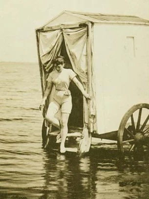 Badekarren bieten zunächst den einzig statthaften und standesgemäßen Zugang zum Badevergnügen. Erfunden in England, dem Mutterland des Bädertourismus, in der Mitte des 18. Jahrhunderts, gehören Badekarren dazu, als in Deutschland die ersten Seebäder öffnen.